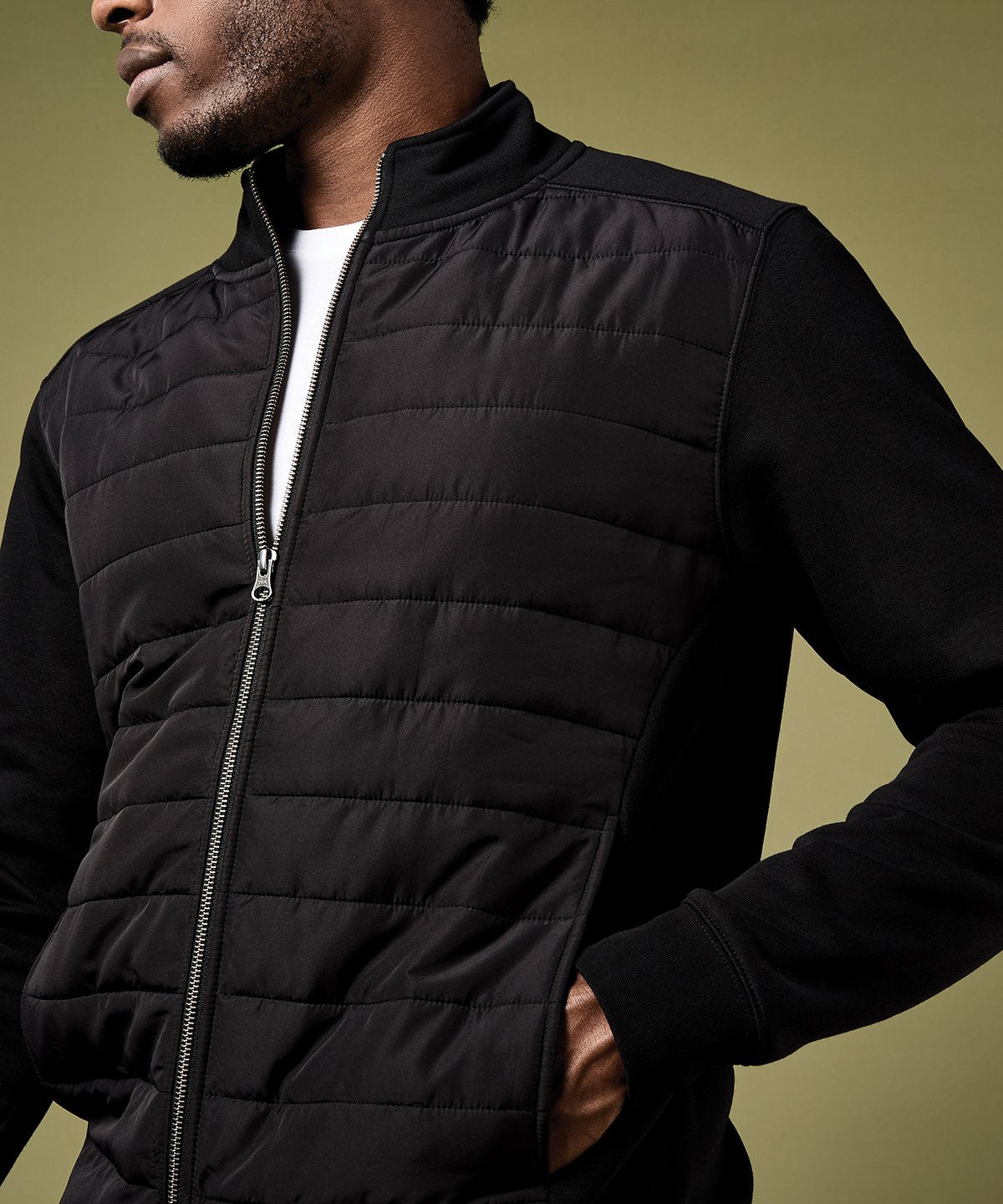 - Strategisch geplaatste, gewatteerde geweven segmenten aan de voorkant bieden gerichte isolatie maar behouden een lichtgewicht, onbeperkte pasvorm